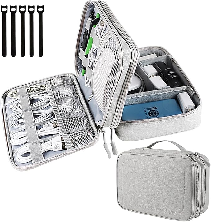 • Multiple compartments for chargers, cables, and SD cards.